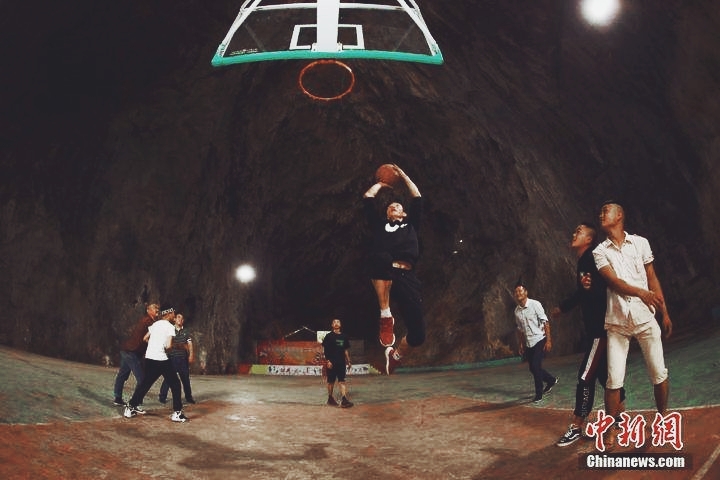 據(jù)介紹,這個(gè)球場(chǎng)位于貴州畢節(jié)市納雍縣豬場(chǎng)鄉(xiāng)新春村后山一個(gè)天然溶洞里,當(dāng)?shù)卮迕褡孀孑呡叾紣鄞蚧@球,便自籌資金在天然山洞里建了這個(gè)籃球場(chǎng),總面積足足有1000平方米。